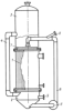 Вторичный (соковый) пар из камеры 2 по трубе 4 поступает в сепаратор 3. При этом вместе с паром увлекается часть (брызги) раствора, т.к. объем камеры 2 невелик и в ней не может быть эффективного отделения пара от раствора, да это и не нужно. Эффективное отделение пара от раствора происходит в сепараторе 3, имеющем достаточный для этого объем. Из сепаратора 3 пар удаляется по соответствующему патрубку, а брызги раствора попадают на распределительное устройство 7.