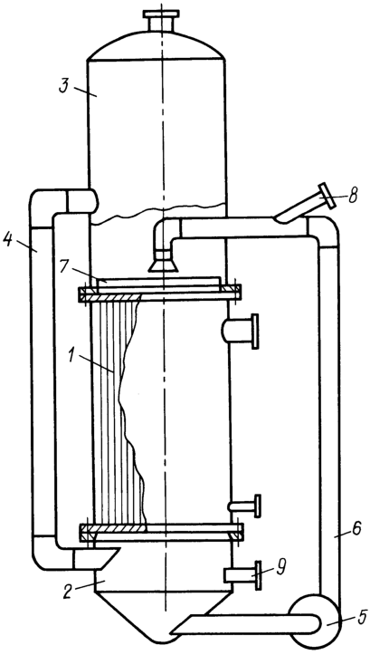 Аппарат состоит из греющей камеры 1 с трубами, завальцованными в трубные решетки, растворной камеры 2, сепаратора 3, паровой трубы 4, соединяющей верхнюю часть камеры 2 и сепаратор 3, насоса 5 с циркуляционной трубой 6, соединяющей нижнюю часть камеры 2 с сепаратором 3, распределительного устройства 7 и патрубков для пара, раствора и конденсата. При этом патрубки 8, 9 служат для подвода исходного и отвода упаренного раствора соответственно.