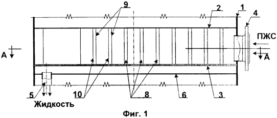 Предлагаемый сепаратор работает следующим образом. ПЖС из нагревательной печи (не показана) по входному патрубку 4 подают в полость сепаратора, при этом скорость ее резко снижается. Сплошная жидкая фаза ПЖС проходит через перфорацию нижней крышки 3, стекает в поддон 6 и через сливной патрубок 5 поступает на отпарную тарелку колонны (не показана). Паровая фаза ПЖС с захваченной капельной жидкостью поступает в зазоры между полыми элементами 8 и движется к боковым выходам из пакетов. При движении между полыми элементами 8 тяжелая часть потока (капли жидкой фазы) под действием центробежной силы прижимается к перфорированным пластинам 9 и проходит в ограниченное пространство между пластинами 9 и 10, а затем через нижнюю перфорированную крышку 3 – в поддон 6 и через сливной патрубок 5 – на отпарную тарелку ректификационной колонны 1. Та часть пленки жидкости, которая не успела пройти через перфорацию стенки 9, задерживается пластинкой 11 и также проваливается вниз. Легкая паровая фаза отделяется от капельной жидкости и устремляется через зазоры между полыми элементами 8 в свободное пространство колонны.