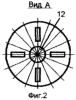 Пылеуловитель вихревой содержит цилиндрический корпус 4 с коническим бункером 11, расположенным в нижней части. Осевой входной патрубок 5 и патрубок 6 заканчиваются цилиндром 7 большего диаметра, на торцевой поверхности которого выполнен завихритель 8 жалюзийного типа с лопастями 9 для закручивания первичного пылегазового потока. Лопасти 9 получены методом неполной просечки и последующего отгиба их на требуемый угол (фиг.2). Их количество определяется требованиями к аэродинамическим характеристикам закрученного потока и должно быть не менее 4-х. В верхней части корпуса тангенциально ему расположен патрубок 1 для ввода вторичного потока с лопаточным завихрителем 2. Выходной патрубок 3, установленный на лопаточном завихрителе 2, служит для вывода очищенного воздуха. Обтекатель 12 и отбойная шайба 10 также размещены на торцевой поверхности цилиндра 7. Жалюзийный завихритель 8 может быть расположен на конической поверхности обтекателя 12, являющегося продолжением цилиндра 7, а отбойная шайба 10 установлена на боковой поверхности цилиндра 7, и профиль ее выполнен в виде треугольника (см. фиг.3).