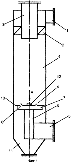 Недостатком прототипа является сравнительно невысокая эффективность процесса пылеулавливания за счет невысокой интенсивности закрутки первичного воздушного потока и возникновения обратных токов газа около оси аппарата, которые препятствуют движению частиц, находящихся в центральной части, от центра к периферии и тем самым удалению их из аппарата. Эти частицы увлекаются обратными токами газа к центру и выносятся из аппарата через выходной патрубок, что снижает эффективность пылеулавливания аппарата.