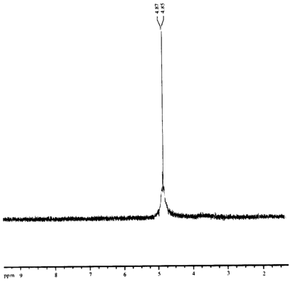 Пример 15. Процесс проводят, как в примере 5, отличие состоит в том, что реакцию окисления фенола (1 мМ) проводят в D2O. Реакционную массу анализируют методом ЯМР 1Н. Степень очистки водного раствора от продуктов окисления фенола близка к 100%, о чем свидетельствует наличие в ЯМР спектре только сигналов от H2O ( =4.87 м.м.д.) и D2O ( =4.85 м.м.д.) (см. чертеж, на котором представлен ЯМР 1Н спектр раствора после проведения реакции окисления фенола ([PhOH]/[H2O2]=1/14 моль/моль, [катализатор]=1 г/л, 60° С, 2.5 ч).