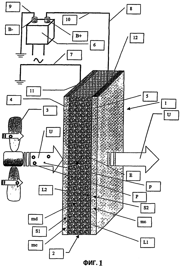 Два проводника 7, 8 соединены одними концами 9, 10 соответственно с одними из выводов В+, В- напряжения и/или с заземлением, и другими концами 11, 12 соединены с одним из электродов 4, 5 с различной полярностью. В представленном варианте проводник 7 частично заменен заземлением G.