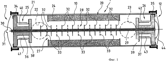 Отражатели, закрепленные соответственно на диске 34 и колпаке 38, обозначены позициями 40 и 41, а отражатели, закрепленные соответственно на диске 35 и колпаке 39, имеют позиции 42 и 43. Каждая пара концентрических отражателей образует таким образом отражательную перегородку для газового потока в фильтрующем элементе 20.