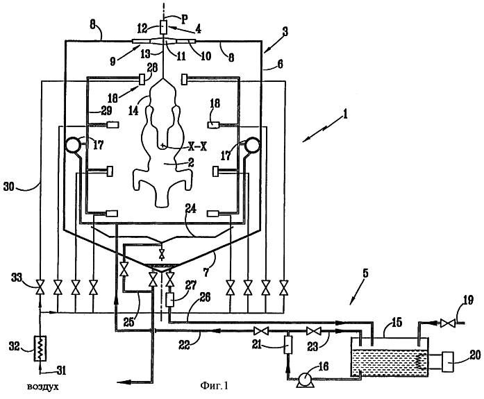 В качестве варианта выполнения возможны и другие расположения форсунок 28 внутри камеры 3, некоторые из форсунок могут быть не направлены непосредственно на порции пищевого мяса 2, в виде тушек. Это схематично представлено на фиг.1 для четырех нижних форсунок.