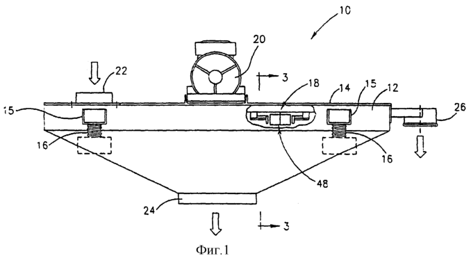 Фиг.1 – вид сбоку с частичным вырывом самоочищающегося вибрационного сепаратора, имеющего смонтированную в нем многочастотную адаптерную систему согласно изобретению;