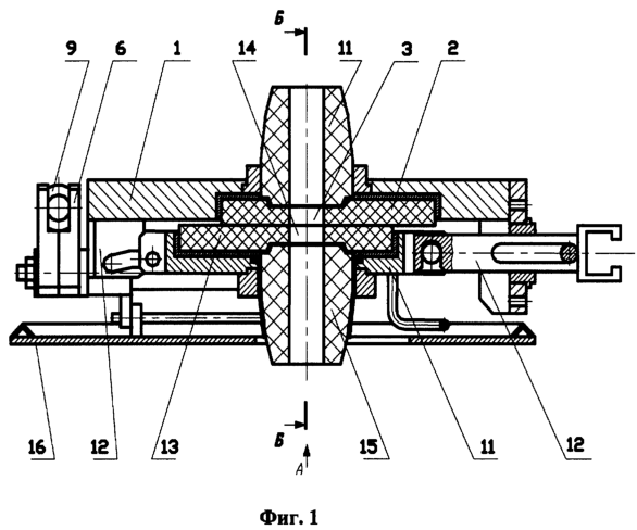 Шиберный затвор литейного ковша содержит монтажную раму 1, на которой производится монтаж деталей и узлов шиберного затвора. В монтажной раме 1 размещена неподвижная огнеупорная плита 2 с отверстием 3. В опорах вращения 4 монтажной рамы 1 параллельно по обе стороны от продольной оси затвора расположены валы 5. На одном конце соответствующих валов 5 установлены первые плечи 6 двуплечих рычагов первого рода, которые отжаты друг от друга одним общим пружинным блоком 7. Продольная ось пружинного блока 7 перпендикулярна продольной плоскости затвора. На втором конце соответствующих валов 5 установлены вторые плечи 8 двуплечих рычагов первого рода, которые лежат в плоскости, проходящей через ось отверстия 3 неподвижной огнеупорной плиты 2 перпендикулярно продольной оси затвора. Таким образом, первые 6 и вторые 8 плечи двуплечих рычагов первого рода расположены в параллельных плоскостях. На вторых плечах 8 двуплечих рычагов первого рода размещены опорные элементы 9, которые установлены на осях симметрично от продольной оси затвора с возможностью взаимодействия с боковыми направляющими выступами 10 каретки 11, параллельными продольной оси затвора. Каретка 11 связана с механизмом ее перемещения 12, ось которого параллельна плоскости монтажной рамы 1. В каретке 11 установлена подвижная огнеупорная плита 13 с отверстием 14 и стакан-коллектор 15. Защита шиберного затвора от теплового излучения производится посредством теплового экрана 16.