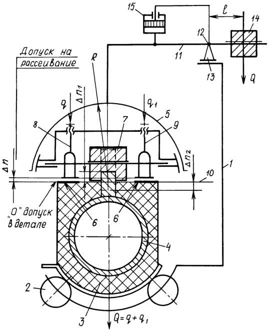 Фрезерный модуль 5 закреплен на штанге 11, качающейся в шарнирной опоре 12 подвижного суппорта 13, имеющего возможность перемещаться вдоль или поперек обрабатываемой детали 4 в свободном плавающем режиме. На втором конце штанги 11 установлен противовес 14, вес которого Q1 и расстояние l от шарнирной опоры 12 регулируют прижим силой Q фрезерного модуля 5 к опорным площадкам 6 рабочей оболочки 3 с деталью 4. Для дополнительного поджатия фрезерного модуля 5 через штангу 11 имеется гидравлический демпфер 15.