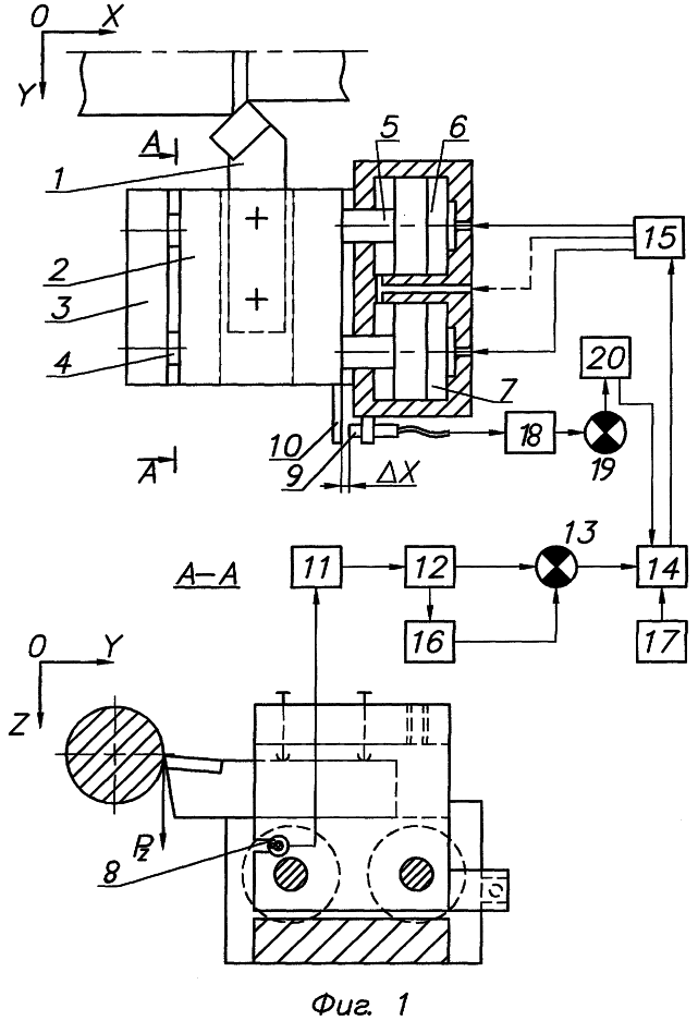 Устройство содержит инструмент 1, жестко закрепленный в резцедержателе 2. Механизм малых перемещений 3 установлен на суппорте станка. Резцедержатель 2 закреплен на штоках 4 и 5 рабочих гидроприводов 6 и 7. В резцедержателе 2 установлен первичный преобразователь усилий 8. На корпусе механизма малых осевых перемещений 3 установлен первичный преобразователь перемещений 9 и флажок 10. Канал управления состоит из последовательно соединенных усилителя сигналов 11, полосового фильтра 12, блока сравнения 13, электромеханического преобразователя 14 и сервопривода 15 малых перемещений. Канал управления оснащен блоком 16 формирования управляющего сигнала о среднем значении силы резания. Первичный преобразователь перемещений 9 оснащен усилителем сигналов 18, подключенным к блоку сравнения 19. Генератор сигналов 17 со встроенным задатчиком и фазовый блокиратор 20 подключены к электромеханическому преобразователю 14.