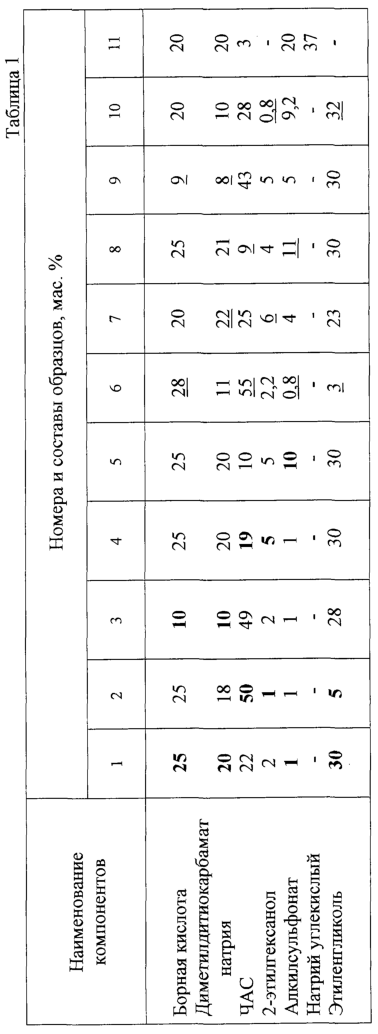 Изобретение относится к лесной и деревообрабатывающей отраслям промышленности и предназначено для защиты древесины, например сырых пиломатериалов, от деревоокрашивающих и плесневелых грибов. В соответствии с ГОСТ 10950-78 “Пиломатериалы и заготовки. Антисептирование способом погружения”, пиломатериалы и заготовки, предназначенные к транспортированию и (или) хранению с влажностью выше 22%, антисептируют водорастворимыми защитными средствами, если в этих пиломатериалах или заготовках не допускаются или ограничиваются плесень и заболонные грибные окраски. Известны средства для защиты древесины от синевы и плесневения: по А.С. СССР №1659194, МПК В 27 К 3/52, Б.И. №24, 1991 г.; по А.С. СССР №1698062, МПК В 27 К 3/34, Б.И. №46, 1991 г. и по Патенту РФ №2045393, МПК6 В 27 К 3/52, Б.И. №28, 1995 г. Недостатком указанных средств является содержание в них либо токсичных галогенсодержащих органических веществ, либо аммиака и синтетических жирных кислот с резким запахом, либо дефицитных компонентов – тиомочевина. Наиболее близким к предложенному является средство для защиты древесины (Патент РФ №2147510, МПК7 В 27 К 3/52, Б.И. №11, 2000 г.) со следующим составом компонентов, маc. %: борная кислота или ее соль 10-25, диметилдитиокарбамат натрия 10-30, сульфонаты 20-30, углекислые соли или основания щелочных металлов остальное до 100. Предложенное средство может дополнительно содержать в качестве фунгицида четвертичные аммониевые соли (ЧАС) в количестве 0,5-3 маc. % и используется в порошкообразном или в жидком виде. Однако это средство также имеет ряд существенных недостатков. Приготовленное в порошкообразной форме, оно склонно к пылению и поэтому, из-за наличия в рецептуре токсичных компонентов – борной кислоты и кальцинированной соды, является опасным продуктом для работающих с ним и для окружающей среды. Кроме того, содержащаяся в препарате кальцинированная сода (до 50%) трудно растворима в воде. Она в значительных количествах остается не использованной по назначению, собирается на дне ванны для пропитки древесины и тем самым вызывает дополнительные сложности при очистке этих ванн и утилизации образующегося осадка. В жидкой форме данного средства, даже при непродолжительном хранении (менее 1 месяца), из-за высоких концентраций едкого натра и борной кислоты образуются трудно разрушаемые и трудно растворимые осадки, что приводит к большим сложностям на стадии приготовления рабочих растворов для обработки древесины. Кроме того, данный состав не достаточно эффективен против грибов Penicillium chrisogenum и Discula pinicola, что приводит к необходимости увеличения концентраций рабочих растворов и повышенного расхода препарата для достижения необходимых уровней защиты или приводит к снижению качества лесоматериалов при наличии в окружающей среде данного вида гриба. Предложенное изобретение направлено на повышение биологической эффективности и улучшение эксплуатационных свойств средства защиты древесины. Поставленная задача решается средством для защиты древесины от поражения деревоокрашивающими и плесневелыми грибами, содержащим борную кислоту, диметилдитиокарбамат натрия, алкилсульфонат и ЧАС, которое в отличие от прототипа содержит 2-этилгексанол и этиленгликоль при следующем соотношении компонентов, мас.%: борная кислота 10-25 диметилдитиокарбамат натрия 10-20 диметилалкилбензиламмонийхлорид 1