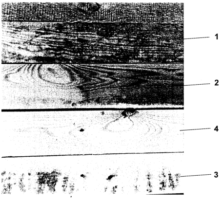 На чертеже приведена фотография деревянных поверхностей, подвергнутых различным типам обработки, а также (для сравнения) необработанной поверхности.