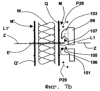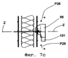 Схематично изображенное на фиг.7а обрезное устройство 8 содержит установленный с возможностью поворота по двойной стрелке Р28 режущий брус 98, проходящий параллельно сетчатым матам M, M’ строительного элемента В и несущий несколько верхних ножей 99, каждый из которых расположен в зоне плоскости Z-Z перемычковых проволок. В изображенных примерах выполнения сетчатые маты M, M’ строительного элемента В расположены стоящими на ребре, так что на фиг.7а плоскость Z-Z перемычковых проволок совпадает с плоскостью чертежа, а режущий брус 98 проходит вертикально. Обрезное устройство 8 содержит, кроме того, установленный с возможностью поворота по двойной стрелке Р29 ножевой брус 100, проходящий параллельно сетчатым матам M, M’ строительного элемента В и несущий несколько нижних ножей 99, каждый из которых расположен в зоне плоскости Z-Z перемычковых проволок.