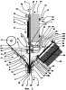 Одновременно перемычковая проволока S во время своей подачи продвигает зажимные колодки 88 стопора 77 обратного хода к его пружине 89 и к более широкому концу клинообразного отверстия стопорных колодок 87, так что стопорные колодки 87 не оказывают движению подачи перемычковой проволоки S практически никакого сопротивления. Перемычковая проволока S посредством совпадающего с линией ввода режущего сопла 94 режущего устройства 79 пропускается сквозь приемный канал С, сформированный в изолирующем теле I за предыдущий рабочий такт с помощью прокалывающей иглы 91. Движение подачи перемычковой проволоки S продолжается до тех пор, пока начало перемычковой проволоки S не будет выступать за плоскость сетчатого мата М и за счет этого на следующей операции не будет сварено с соответствующими проволоками L и Q сетчатого мата М.
