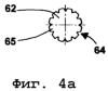 Транспортирующие диски 62 имеют, как показано на фиг.4а, несколько равномерно распределенных по окружности выемок 64 выбираемой глубины для зацепления матов, так что образуются уплощенные зубцы 65. Число выемок 64 для зацепления матов выбирают в соответствии с шагом поперечных проволок сетчатых матов М, М’ с возможностью надежного захвата поперечных проволок Q, Q’ сетчатых матов М, М’ транспортирующими дисками 62 и обеспечения продвижения сетчатых матов М, М’ без проскальзывания. Вследствие наклонного положения валов 58 транспортирующие диски 62 каждой пары продвигающих элементов 17, 17’; 18, 18’ воздействуют не только на одну, но и на несколько поперечных проволок Q, Q’ сетчатых матов М, М’, так что растягивающее усилие распределяется по нескольким проволокам, и они за счет этого при продвижении сетчатых матов М, М’ нагружаются не слишком сильно. Наклонное положение валов 58 обеспечивает, кроме того, непрерывную и без проскальзывания дальнейшую транспортировку сетчатых матов М, М’ следующих друг за другом строительных элементов В, причем следующие друг за сетчатые маты в зоне стыка могут иметь промежутки, возникающие, например, при вырезании кусков проволочных сетчатых полотен G, G’.