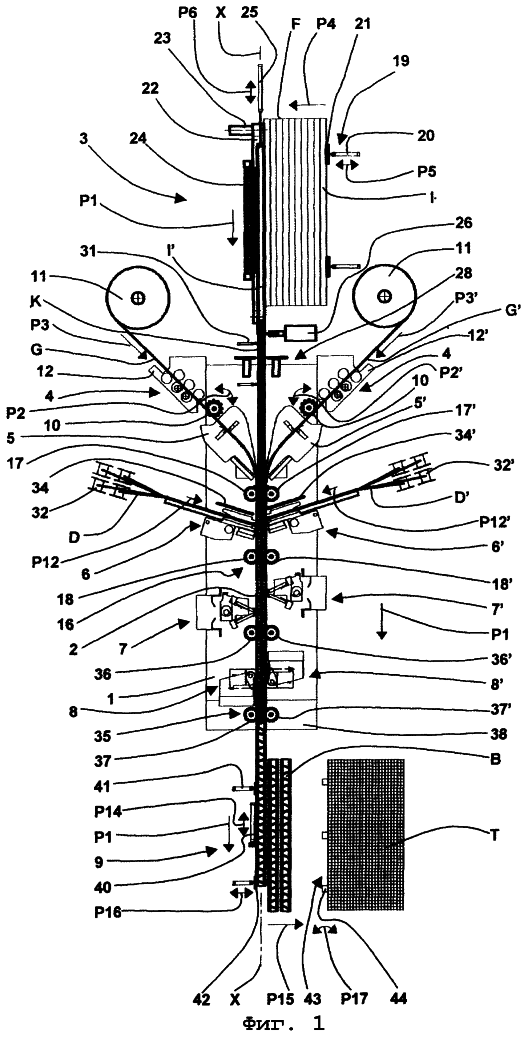 Изображенная на фиг.1 установка содержит основную раму 1, на которой предпочтительно посередине расположен обозначенный лишь схематично горизонтальный, определяющий производственную линию Х-Х технологический канал 2. На входе технологического канала 2 расположено устройство 3 для подачи изолирующего тела W. С обеих сторон технологического канала 2, если смотреть в направлении Р1 производства, расположено по одному устройству 4, 4’ для подачи проволочных сетчатых полотен, по одному устройству 5, 5’ для резки сетчатых матов, по одному устройству 6, 6’ для подачи перемычковых проволок, по одному устройству 7, 7’ для сварки перемычковых проволок и по одному обрезному устройству 8, 8’. На выходе технологического канала 2 расположено, кроме того, поперечное транспортное устройство 9 для строительных элементов.