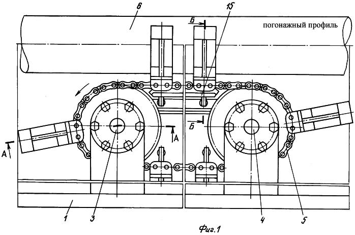 Включают привод 2, который вращает ведущий вал 3 гусенично-протяжного контура 5. Гусенично-прояжный контур 5 начинает движение между ведущим валом 3 и ведомым валом 4. Со стороны ведомого вала 4 рычаги зажима 8 со сменными губками 9 замыкаются на профиле погонажного изделия 6. Замыкание губок 9 осуществляется следующим образом. Сменные губки 9 разводятся при помощи пружины 10 на скошенном участке копиров 12 и выходят в прямолинейное положение для охвата профиля 6 при помощи пневмоцилиндров 13, а затем через копиры 12 с заданным усилием замыкаются на поверхности профиля погонажного изделия 6. Далее осуществляется протягивание профиля 6. При подходе зажимного механизма погонажного профиля 6 к ведущему валу 3 процесс происходит в обратном порядке. По скошенной части копиров 12 при помощи пружины 10 рычаги 8 со сменными губками 9 размыкаются, давая возможность движения погонажного профиля. При этом поддерживающие склизы 15 обеспечивают прямолинейное движение гусенично-протяжного контура 5, не допуская его провисания и деформирования погонажного профиля 6. Ведущий вал 3 и ведомый вал 4 свободно вращаются в роликах 14. Поскольку ролики 14 несут на себе основание 11 с копирами 12 и пневмоцилиндрами 13, то обеспечивается параллельность движения гусенично-протяжного контура 5 и механизмов, обеспечивающих зажим и размыкание зажимного механизма погонажного профиля 6.