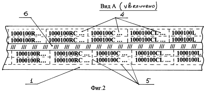 Сущность предлагаемой идентификационной ленты для транспортных средств (ТС) поясняется чертежом, где на фиг.1 показан общий вид идентификационной ленты; на фиг.2 – вид А (вариант увеличенного фрагмента ленты, где, например, 1000100 – индивидуальный цифровой код, R – правая сторона ТС, С – центр ТС, L – левая сторона ТС).