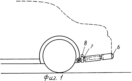 Технический результат достигается тем, что вся конструкция дополнительного бампера крепится к днищу багажника автомобиля. Основную роль в этой конструкции выполняют два толкателя, каждый из которых расположен против “своего” заднего колеса. Толкатель состоит из резьбовой муфты 1, на одном конце которой левая, а на другом правая резьба. С обеих сторон этой муфты ввернуты штоки 2 и 3, которые имеют разную длину и шаг резьбы. Конец штока 2, обращенный к колесу, заканчивается роликом 4. Другой конец штока, обращенный в сторону препятствия, заканчивается пневмоцилиндром 5 и самим дополнительным бампером 6. Крепление толкателя к кузову и его подвижность осуществляются через направляющую муфту 7 и шарнир 8.