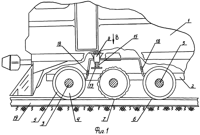 На фиг.1 показана часть секции тепловоза и сечение ее тележки по А-А вид сбоку, на фиг.2 – вид на тележку по стрелке В и на фиг.3 – сечение части тележки по С-С.
