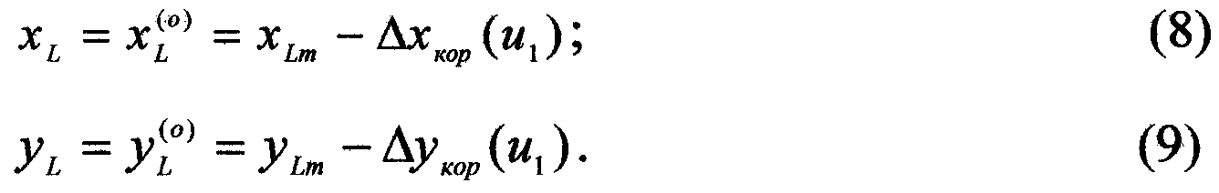 При наклоне второй тележки регистрируемые значения координат хLm, уLm марки изменятся в связи с поворотом отсчетной системы координат X(о), O(о), Y(о) на угол u2 и смещением ее начала на х0(u2) и y0(u2) (см. фиг.3) относительно номинальной системы Xном, Oном, Yном.