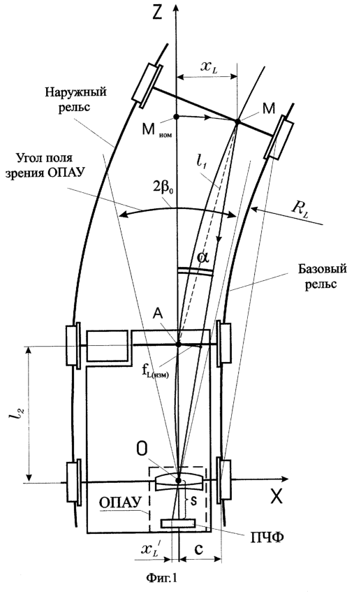 где l1 – заданное конструктивно неизменное расстояние между ближайшими номинально параллельными осями колесных пар первой и второй тележек; R – радиус окружности, содержащей точки O, А, М. Для оптической изображающей системы с корригированными абберациями