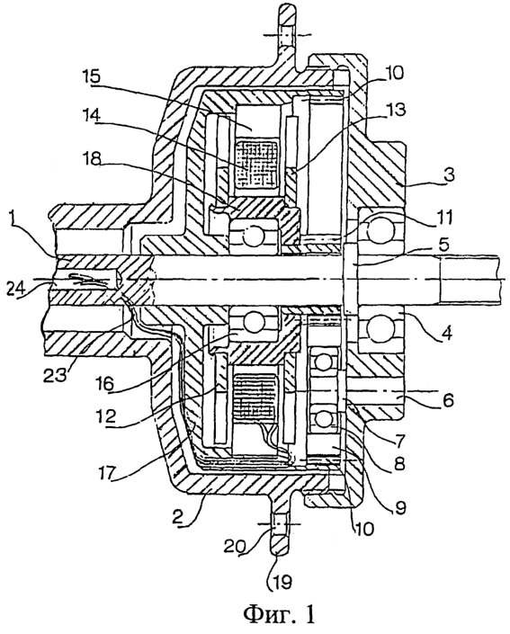 Генератор для велосипеда составляет часть ступицы колеса, установленной на оси 1. Генератор расположен в защитном корпусе 2, оканчивающемся концевой пластиной 3, установленной на оси с помощью шарикоподшипника 4, контактирующего с расположенным на оси 1 фланцем 5. Этот закрытый узел является частью ступицы колеса, при этом корпус 2 имеет наружный фланец 19 с отверстиями для спиц, как в обычной конструкции колес. Другой конец корпуса установлен на оси на соответствующем подшипнике ступицы колеса.