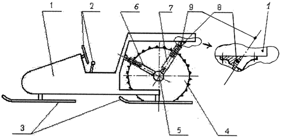 Известно снегоходное транспортное средство (Свидетельство РФ на полезную модель №8675, 1998 г., В 62 М 29/00), содержащее раму, управляемые и опорные лыжи, подвижный в вертикальной плоскости движитель с силовым приводом, выполненный в виде зубчатого колеса, ось которого жестко соединена с тягой и рычагом управления, тормозной механизм и кресло, тяга расположена под острым углом к плоскости рамы, а силовой привод размещен в полости зубчатого колеса.