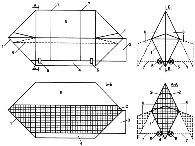 1. Нижняя оболочка 1 выполнена из листового композиционного материала и имеет форму прямой пятиугольной призмы, одна боковая грань и все боковые ребра которой горизонтальны, а на основаниях имеются многогранники, определяющие заостренную форму носовой и кормовой частей дирижабля. Четыре других боковых грани призмы попарно равны и ориентированы. Грани, примыкающие сверху к горизонтальной (нижняя грань оболочки), – боковые грани оболочки. Грани, примыкающие сверху к боковым граням оболочки, – верхние грани оболочки. Оболочка имеет перегородки из листового композиционного материала, которые делят весь объем на одинаковые, герметичные секции 2, например, кубической формы, наполненные водородом или гелием и имеющие дренажно-заправочные средства. Секции, примыкающие к границам оболочки, могут иметь усеченную форму и наполнены гелием. Объем одной секции определяется как меньшее значение из двух: