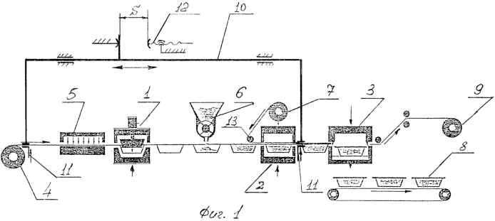 Автоматическая упаковочная машина для продуктов, размещаемых между корпусным и покровным материалом, состоит преимущественно из установленных в определенной технологической последовательности устройств для формовки емкостей 1, термосварки 2 и вырубки 3. Полимерная пленка из рулона 4 поступает через нагреватель 5 в устройство формовки емкостей 1. После заполнения полученных емкостей продуктом с помощью дозатора 6 производится их укупорка покровным материалом, свернутым в рулон 7 и покрытым термосваривающимся слоем. Данная операция осуществляется в устройстве термосварки 2. Далее укупоренные емкости поступают в устройство вырубки 3, где осуществляется вырубка готовых форм 8 с продуктом. Отходы, если они есть, наматываются на барабан 9. Перемещение корпусного 4 и покровного 7 материалов вдоль машины осуществляется транспортером 10 с управляемыми захватами 11. При ходе транспортера вправо (привод не показан) захваты 11 сжаты и перемещают оба материала на фиксированный шаг S, который настраивается с помощью, например, регулируемого упора 12. При ходе транспортера 10 влево захваты разжаты, и оба материала неподвижны – остаются зажатыми в устройствах 1; 2 и 3. Покровный материал 7 укладывается с помощью направляющего валика 13 на корпусной материал 4 в зоне перед устройством термосварки 2.