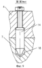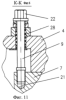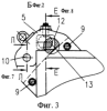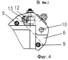 На опорных площадках 3, фиг.5 и 4, фиг.6 закреплены по одному штырю 15 и 16. На площадке 4 – штырь 14 круглого поперечного сечения, а на площадке 3 – штырь 15 с параллельными плоскостями. Штырь 14, фиг.9, закреплен с помощью гайки и шплинта, он воспринимает нагрузки во всех направлениях в плоскости установки такелажного устройства на груз, а штырь 15, фиг.10, – только в плоскости, перпендикулярной плоскости 23, то есть в плоскости, параллельной плоскости 8, фиг.1. Для полного прилегания плоскости 23, фиг.10, штыря 15 к плоскости ответного отверстия 19 в грузе штырь 15 может поворачиваться (самоустанавливаться) вокруг продольной оси за счет, например, зазора между стенками паза 24 в ручке 25 и ограничительного винта 26. Ручка 25 закреплена, например, штифтом 27. Оба штыря 16 и 15, фиг.8, входят в отверстия груза, выполненные с маленькими зазорами (по посадке 7 квалитета). Это не дает возможность смещаться опорным площадкам 3, 4 относительно груза. Следовательно, изгиб болтов 9, крепящих такелажное устройство так же будет отсутствовать, как и изгиб болтов на опорных площадках 5 и 6. Это исключает поломку болтов, следовательно, повышается надежность и обеспечивается безопасность в эксплуатации. Все болты крепления такелажного устройства не снимаются с рамы. Болты снабжены пружинами 28, фиг.11, усилиями которых они отводятся после вывинчивания из зоны резьбовых отверстий. Это уменьшает время монтажа и демонтажа такелажного устройства и исключает поломку болтов при монтаже. Надежность повышается.