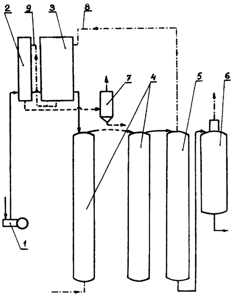 Схема включает в себя поршневой насос 1, прокачивающий пульпу через подогреватели 2 и 3, автоклавную батарею 4, состоящую обычно из 8-10 автоклавов (на чертеже указаны два), самоиспарители 5 и 6 первой и второй ступени соответственно. Для снижения давления конденсата из подогревателя 2 служит самоиспаритель 7. Подача пара из самоиспарителя 5 в подогреватели 3 осуществляется по трубопроводу 8, а подача паро-конденсатной смеси из подогревателей 3 в подогреватель 2 – по трубопроводу 9. Остальные трубопроводы не обозначены как не входящие в отличительную часть данного технического решения от известных.