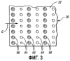 Как также показано на фиг.2, транспортирующее устройство 20 верхнего расположения предпочтительно выполнено в виде конструкции, описанной в патенте США 5002599, выданном на имя McMaster и др., полное описание которого настоящим включено в данную заявку путем ссылки. Более точно, это транспортирующее устройство 20 верхнего расположения, как указано выше, изготовлено из жаропрочного тонколистового металла, такого как нержавеющая сталь, и имеет проходящую в горизонтальном направлении, нижнюю плиту 76, которая определяет обращенную вниз поверхность 22, в которой первая и вторая группы отверстий 64 и 66 выполнены, как рассмотрено выше. Проходящая в горизонтальном направлении верхняя плита 78 расположена над нижней плитой 74 и закрыта верхним элементом 80 из тонколистового металла, взаимодействующим с верхней плитой 78 с образованием первой камеры 82, в которой создается разрежение посредством источника 84 разрежения [вакуума]. Верхняя плита 78 имеет отверстия, сообщающиеся с верхними концами трубчатых элементов 86, нижние концы которых сообщаются с первой группой отверстий 64 в нижней плите 76 для формирования разрежения у обращенной вниз поверхности 22, как было описано выше.