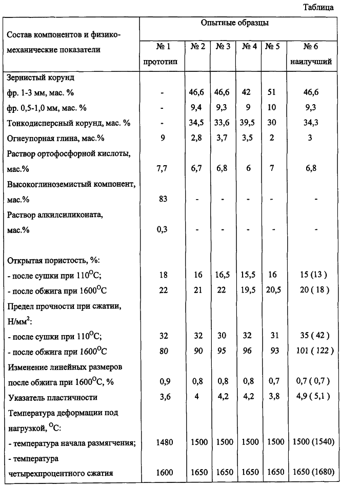 Изобретение относится к области производства огнеупоров, в частности огнеупорных набивных масс на основе корундовых огнеупорных заполнителей и глинистых пластификаторов, и преимущественно может быть использовано в металлургической и других отраслях промышленности для изготовления набивных футеровок различных высокотемпературных агрегатов. Огнеупорная набивная масса содержит смесь зернистого корунда фр. 1-3 мм и фр. 0,5-1,0 мм, взятых в соотношении (4,5:1)-(5,5:1), смесь тонкодисперсных корунда в количестве 91-95 мас.% и огнеупорной глины в количестве 5-9 мас.% с содержанием в смеси частиц размером менее 50 мкм не менее 50% и размером более 63 мкм не более 20% и ортофосфорную кислоту при следующем соотношении компонентов, мас.%: смесь зернистого корунда – 51-61, смесь тонкодисперсных корунда и огнеупорной глины – 32-43, ортофосфорная кислота – 5,5-7,5. В качестве смеси тонкодисперсных корунда и огнеупорной глины используют их механическую смесь или смесь совместного помола. Масса обеспечивает снижение открытой пористости, повышение прочности и огнеупорных свойств футеровок, получаемых на ее основе, а также повышение ее удобоукладываемости за счет увеличения пластичности. 2 з.п. ф-лы, 1 табл.