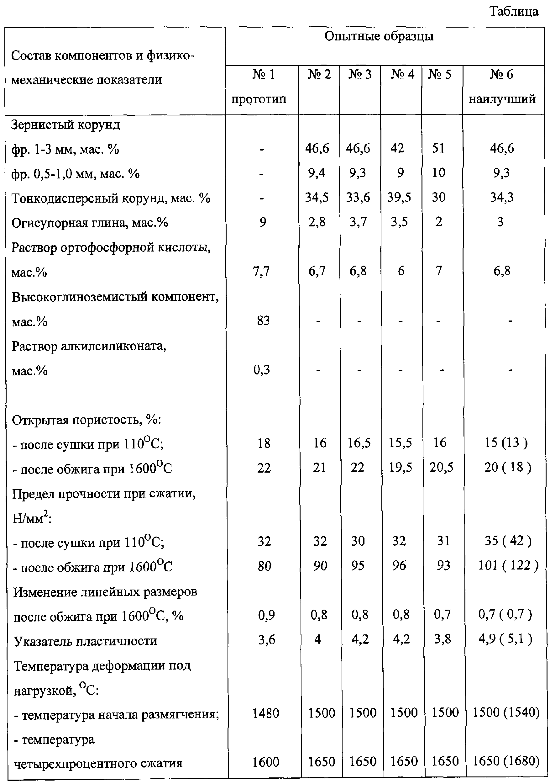 Изобретение относится к области производства огнеупоров, в частности огнеупорных набивных масс на основе корундовых огнеупорных заполнителей и глинистых пластификаторов, и преимущественно может быть использовано в металлургической и других отраслях промышленности для изготовления набивных футеровок различных высокотемпературных агрегатов, например днищ и гнезд сталеразливочных ковшей, центральных частей сводов дуговых электропечей, а также электропечей выдержки жидкого чугуна и плавки алюминия. Известна огнеупорная набивная масса по авторскому свидетельству СССР №897755, 1982, С 04 В 33/22, которая используется для выполнения набивных футеровок сталеразливочных ковшей и содержит 55-65 мас.% высокоглиноземистого шамота, 20-30 мас.% корундовых отходов абразивного производства, 5-10 мас.% огнеупорной глины, 0,25-1,50 мас.% полифосфата натрия и 4,75-8,50 мас.% ортофосфорной кислоты. Использование в данной огнеупорной набивной массе в качестве заполнителя высокоглиноземистого шамота приводит к недостаточно высокой прочности футеровки после ее обжига при температуре 1580°С, характеризуемой пределом прочности при сжатии не выше 37-41 Н/мм2. Сравнительно высокое процентное содержание в данной массе ортофосфорной кислоты и наличие в ее составе полифосфата натрия вызывает достаточно существенный линейный рост футеровки после ее обжига при температуре 1580°С, характеризуемый изменением линейных размеров на уровне 0,9-1,0%. Кроме того, сравнительно большое процентное содержание в данной массе огнеупорной глины не позволяет обеспечить ей высоких огнеупорных свойств, которые ограничивают рекомендуемый температурный интервал службы в пределах 1500-1700°С. Известна огнеупорная набивная масса по патенту Украины №27903, 2000, С 04 В 33/22, которая используется для выполнения монолитных футеровок индукционных канальных печей выдержки чугуна и содержит 50-55 мас.% электроплавленного корунда фр. 3,0-0,5 мм, 32-37 мас.% глинозема ГК, 4-6 мас.% кварцевого песка и 7-9 мас.% ортофосфорной кислоты. Сравнительно высокое процентное содержание в данной массе ортофосфорной кислоты и глинозема, а также наличие в ее составе кварцевого песка вызывает достаточно значительный линейный рост футеровки после ее обжига при температуре 1580°С, который, как показали экспериментальные исследования заявителя, сопровождается изменением линейных размеров в пределах 1,2-1,5%. Наличие в составе данной массы кварцевого песка приводит к недостаточно высоким огнеупорным свойствам получаемых на ее основе футеровок, характеризуемых рабочей температурой службы не более 1600°С. Кроме того, необходимые для получения высокой прочности футеровок реакции образования муллита и неразлагающихся фосфатов алюминия при обжиге футеровки на основе данной массы протекают сравнительно медленно, что требует весьма длительного времени выдержки обжигаемой футеровки при температуре около 1600°С, составляющего 6-8 часов. Известна огнеупорная набивная масса по патенту Российской Федерации №2074148, 1997, С 04 В 28/34, С 04 В 35/10, которая используется для выполнения набивной футеровки сталеразливочных ковшей при разливке стали с внепечной обработкой и содержит 81-85 мас.% высокоглиноземистого компонента, 7-12 мас.% огнеупорной глины и 7-10 мас.% смеси водного раствора ортофосфорной кислоты с концентрацией 40-50% и водного раствора карбамида 