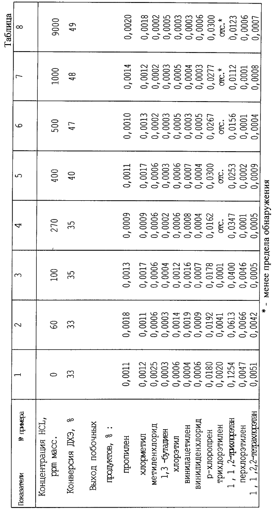 Винилхлорид (ВХ) является одним из важнейших мономеров. На его основе получают большое количество полимеров, имеющих широкий спектр различных свойств (механических, электрических, оптических и др.). В мировой промышленной практике ВХ получают в основном сбалансированным методом из этилена через стадию газофазного, термического дегидрохлорирования (пиролиза) 1,2-дихлорэтана (ДХЭ) (Bunten M.J. et. al. Encyclopedia of Polymer Science and Engineering. Volumes 17 and Supplement. – Jhon Wiley & Sons Inc.,1989, p.247 [1]). Этот метод имеет ряд недостатков, а именно: низкую конверсию ДХЭ за один проход, образование большого количества побочных продуктов, кокса и смол. Для улучшения технико-экономических показателей процесса пиролиза ДХЭ предлагается проводить его в присутствии различных веществ, которые называются промоторами или инициаторами. Их использование позволяет повысить конверсию ДХЭ, снизить образование кокса и некоторых побочных веществ. Известны способы пиролиза ДХЭ в присутствии молекулярного хлора (Авторское свидетельство СССР №218680, 1966; Патент Великобритании №1225210, 1969 [2, 3]), кислорода (Авторское свидетельство СССР №1066979 [4]), неорганических и органических производных галогенов (Патент США №4851597, 1989 [5]). Хлорированные и бромированные производные ацетона, в частности гексахлор- или гексабромацетон, инициируют пиролиз ДХЭ в массовом соотношении 0.01-0.00001:1 (Патент США №4584420, 1986). При этом выход ВХ возрастает вместе с увеличением количества вредных побочных продуктов – хлоропрена и ацетилена. Значительно повышается конверсия ДХЭ при пиролизе в присутствии 250-1000 ppm масс. бензотрихлорида (Патент США №5210345, 1993). Конверсия ДХЭ в отсутствии добавки составляла в условиях опытов 51.8%, а в присутствии ее в количестве 500 ppm составляла 81%. Отмечается, что концентрация хлораля (мг/100 граммов ДХЭ) при этом снижается от 0.4 до практически отсутствия. В обычной промышленной практике хлораль и хлоральгидрат стараются удалить из ДХЭ, поступающего на пиролиз (см., например, патенты США №№3488398, 3996300, 4151212, 4172099), из-за их коррозионной активности по отношению к материалам реактора. Однако авторы изобретения, описанного в международной заявке WO 96/35653, А1 (опубликована 14.11.96), считают, что, если материалы, из которых изготовлено оборудование, коррозионно устойчивы к хлоралю и хлоральгидрату, то их применение в пиролизе ДХЭ очень полезно. В присутствии 300 ppm хлораля выход ВХ в условиях эксперимента возрастает примерно на 10%. В промышленной печи наблюдался рост конверсии на 5-10% и снижение количества винилацетилена практически до нуля. Использование в пиролизе таких инициаторов, как тионилхлорид, сульфурилхлорид, нитрозилхлорид [5], приводит к необходимости разработки мероприятий для очистки потоков от соединений серы, оксидов азота. Органические инициаторы – гексахлорэтан, октахлорпропан, трихлорацетилхлорид, гексахлорацетон и др. должны быть специально синтезированы и очищены. Цель данного изобретения – улучшение процесса пиролиза ДХЭ, а именно повышение конверсии и снижение выхода побочных продуктов за счет применения дешевого, легко доступного инициатора. Поставленная цель достигается тем, что в способе инициированного пиролиза ДХЭ в качестве инициатора используется хлористый водород. Концентрация хлористого водорода варьируется в диапазоне 50-10000 ppm массовых. Пиролиз ДХЭ целесообразно проводить при т