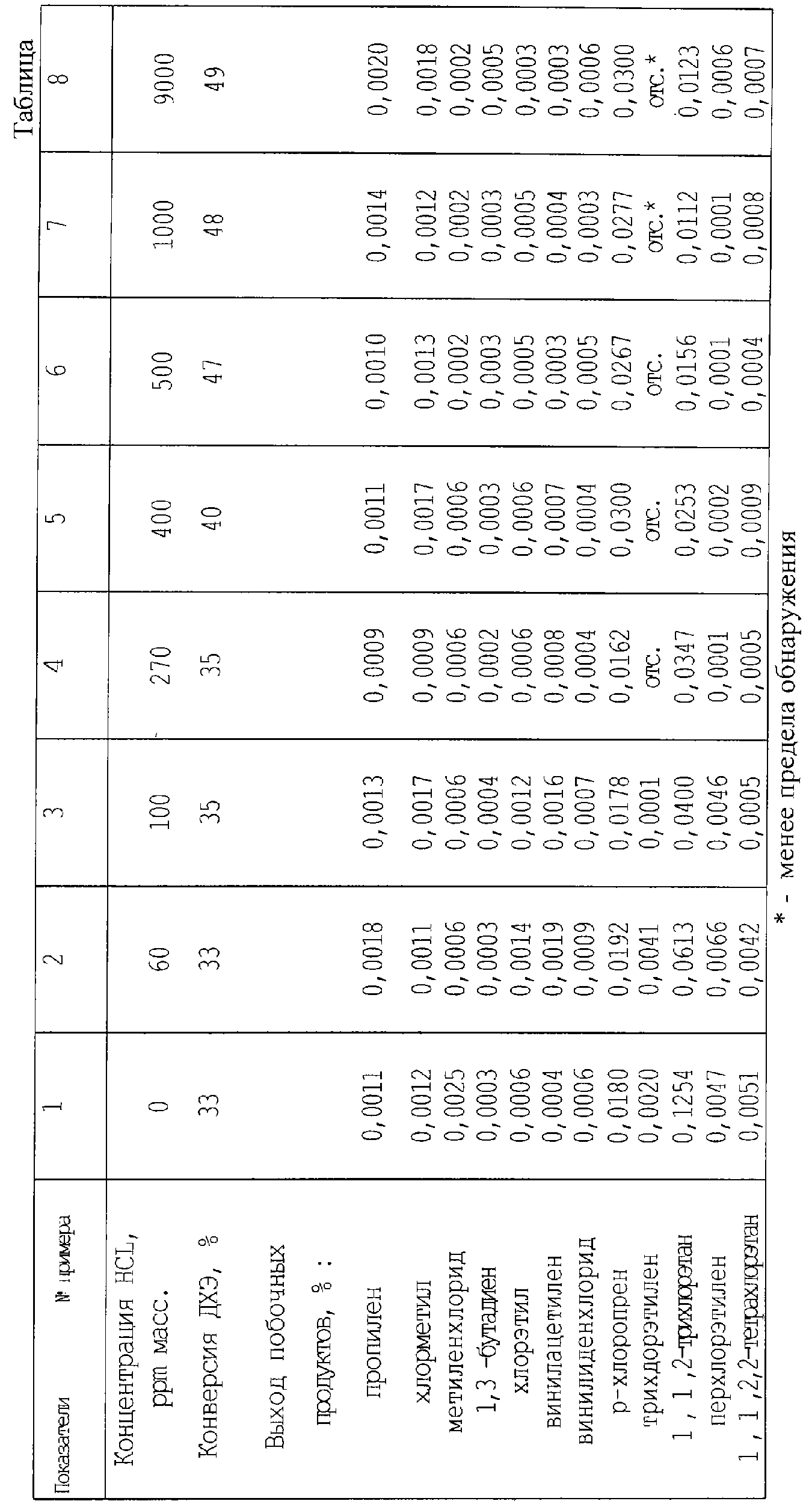 Использование: химия хлорорганических соединений. Сущность: проводят газофазное термическое дегидрохлорирование (пиролиз) 1,2-дихлорэтана в присутствии промотора – хлористого водорода, который растворен в питающем сырье. Концентрация хлористого водорода находится в диапазоне 50-10000 ppm массовых. Технический результат: повышение конверсии сырья и снижение выхода побочных продуктов. 2 з.п. ф-лы, 1 табл.
