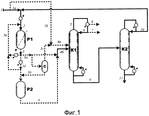 При использовании реакционной зоны Р2 реакционную смесь из нее выводят по линии 4 и подают в К1 по линии 4б.