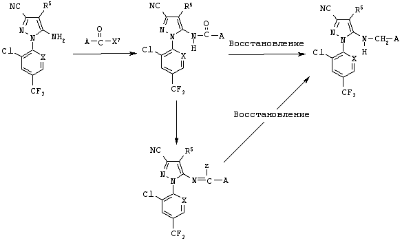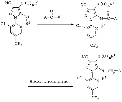 На реакционной схеме 7 представлен способ получения производного пиразола общей формулы (1), где n равно 0, включающий обработку производного пиразола общей формулы (2), где R5 представляет собой тиоцианатогруппу, и Y представляет собой Y-3, соединением R1-X2, где R1 имеет то же значение, что и в общей формуле (1), и X2 представляет собой атом галогена или триметилсилильную группу.