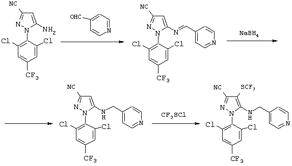 Более того, в WO98/45274 описано, что производное пиразола, имеющее 4-пиридилметиламиногруппу в 5-положении, может быть получено обработкой аминогруппы, имеющейся в 5-положении пиразольного производого, пиридил-4-альдегидом с образованием имина, а затем восстановлением имина (реакционная схема 4).