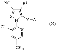8. Способ получения производного пиразола общей формулы (1), где n равно 0, включающий обработку производного пиразола общей формулы (2), где R5 представляет собой группу тиоцианата, А представляет собой А-1 или А-3, R4 представляет собой водород и Y представляет собой Y-3, соединением R1-X2, где R1 имеет те же значения, что указаны для общей формулы (1), и X2 представляет собой атом галогена или триметилсилильную группу.