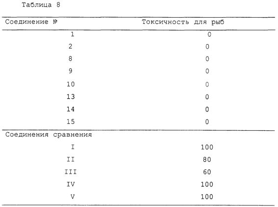 Как видно из таблицы 8, все испытания для соединений I-V показали высокую степень смертности рыб, но смертельных случаев не наблюдалось в случае соединений изобретения. Таким образом, соединения по изобретению являются хорошо работоспособными даже, если агент для борьбы применяют непосредственно в водной системе, например, в случае рисовых полей.