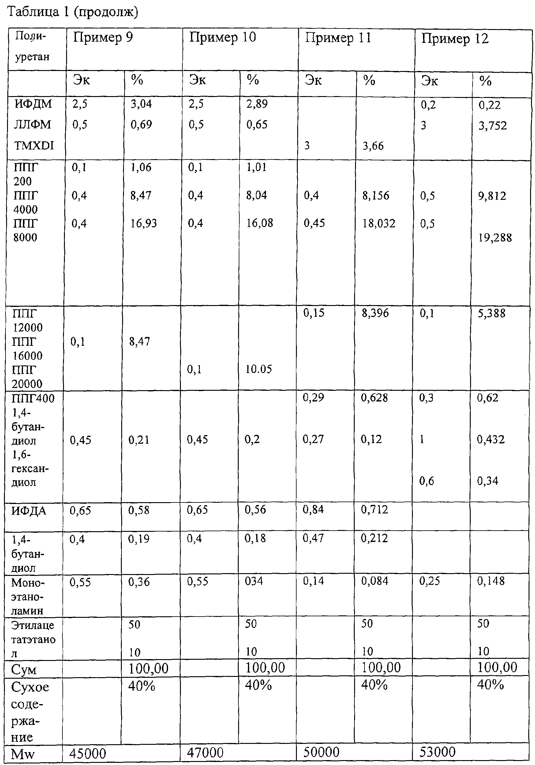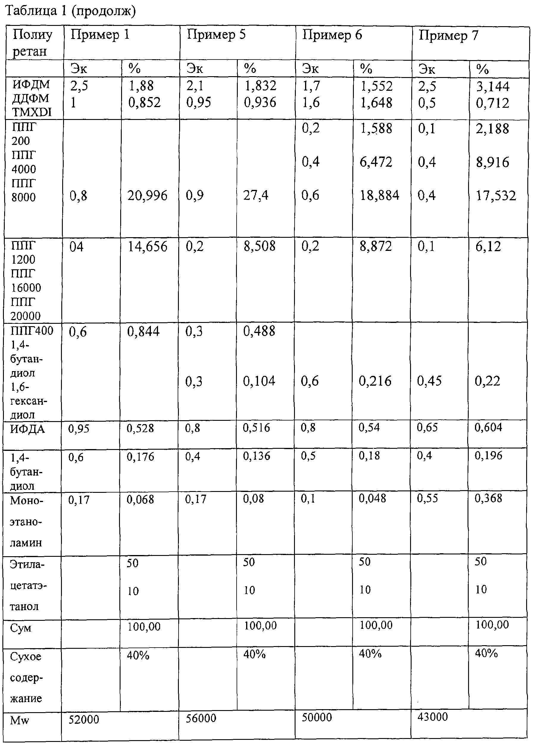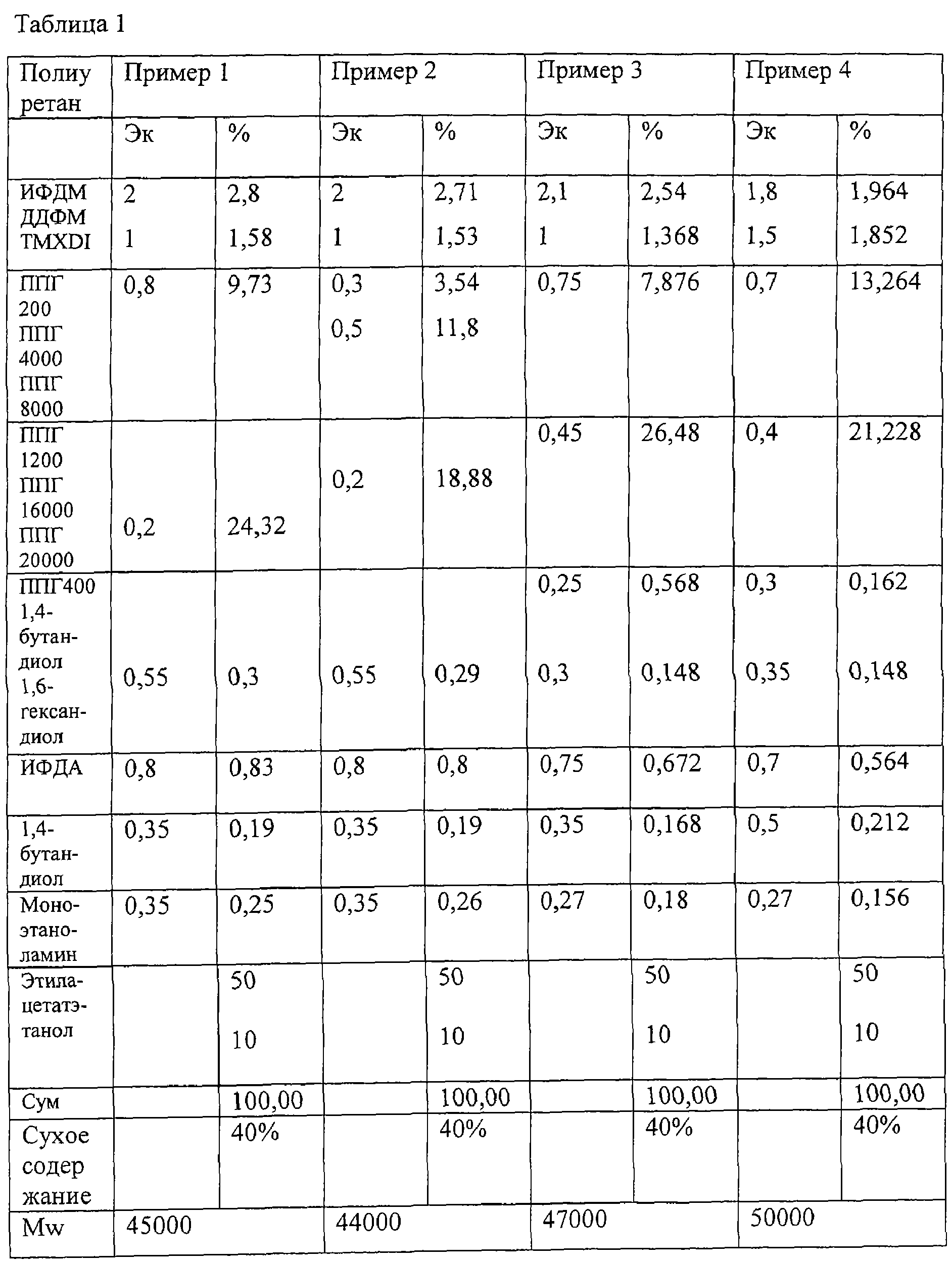 1. Полиуретановая смола, являющаяся продуктом реакции, по меньшей мере, одного диизоцианата и изоцианатных реакционноспособных компонентов, которые содержат первую группу, по меньшей мере, одного полиола, вторую группу, по меньшей мере, одного полиола и третью группу, по меньшей мере, одного полиола, и, дополнительно, по меньшей мере, одного амина и прекращающего реакцию агента, причем все полиолы указанной первой группы имеют среднюю молекулярную массу в пределах значений от 1000 до 10000 г/моль, отличающаяся тем, что все полиолы указанной второй группы имеют среднюю молекулярную массу в пределах значений свыше 10000 до 20000 г/моль; все полиолы указанной третьей группы имеют среднюю молекулярную массу, равную или меньшую 800 г/моль, а отношение эквивалентных масс диизоцианата и изоцианатных реакционноспособных компонентов выбирают такими, что, по существу, все изоцианатные группы диизоцианата присутствуют как продукт реакции с одной из указанных изоцианатных реакционноспособных функциональных групп. 2. Полиуретановая смола по п.1, отличающаяся тем, что отношение эквивалентных масс диизоцианата и совокупности полиолов первой и второй групп составляет от 3,6:1 до 2,3:1; предпочтительно 3:1. 3. Полиуретановая смола, получаемая за счет реагирования смеси, содержащей первую группу, по меньшей мере, одного полиола и второй группы, по меньшей мере, одного полиола с, по меньшей мере, одним диизоцианатом до первого изоционатного оборванного форполимера; отличающаяся тем, что все полиолы указанной первой группы имеют среднюю молекулярную массу в пределах значений 1000 – 10000 г/моль; все полиолы указанной второй группы имеют среднюю молекулярную массу в пределах значений свыше 10000 – 20000, а отношение эквивалентных масс диизоцианата и совокупности полиолов первой и второй групп составляет 3,6:1 – 2,3:1; на втором этапе – за счет реагирования первого изоцианатного оборванного форполимера с третьей группой, по меньшей мере, одного полиола; при этом все полиолы третьей группы имеют среднюю молекулярную массу, равную или меньшую, чем 800 г/моль, – до насыщенной полиуретановой смолы. 4. Полиуретановая смола по п.1, отличающаяся тем, что первый изоцианатный оборванный форполимер реагирует с третьей группой полиолов до второго изоцианатного оборванного форполимера и в третьей группе второй форполимер реагирует, по меньшей мере, с одним диамином и, дополнительно, с обрывающим агентом – до насыщенной полиуретановой смолы. 5. Полиуретановая смола по п.1, отличающаяся тем, что полиолы второй группы имеют среднюю молекулярную массу в пределах значений 10500 – 18000 г/моль, более предпочтительно 11000 – 16000 г/моль. 6. Полиуретановая смола по п.1, отличающаяся тем, что отношение эквивалентных масс диизоцианата и компонентов, имеющих изоцианатные реакционноспособные функциональные группы, составляет 0,95:1 – 1,2:1. 7. Полиуретановая смола по п.1, отличающаяся тем, что отношение эквивалентных масс полиолов первой группы и полиолов второй группы составляет 1,5:1 – 9:1, предпочтительно 3:1 – 8:1, более предпочтительно 5:1 – 6:1. 8. Полиуретановая смола по п.1, отличающаяся тем, что отношение эквивалентных масс полиолов первой группы и полиолов второй группы составляет 50:1 – 60:1. 9. Полиуретановая смола по п.1, отличающаяся тем, что отношение эквивалентных масс суммы полиолов первой группы, полиоло