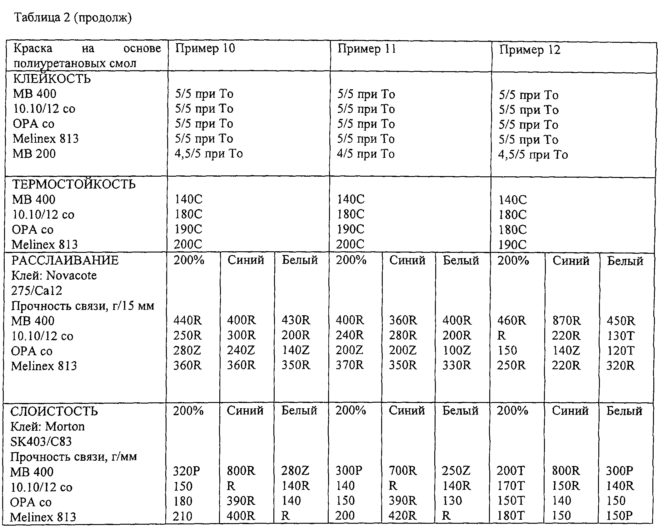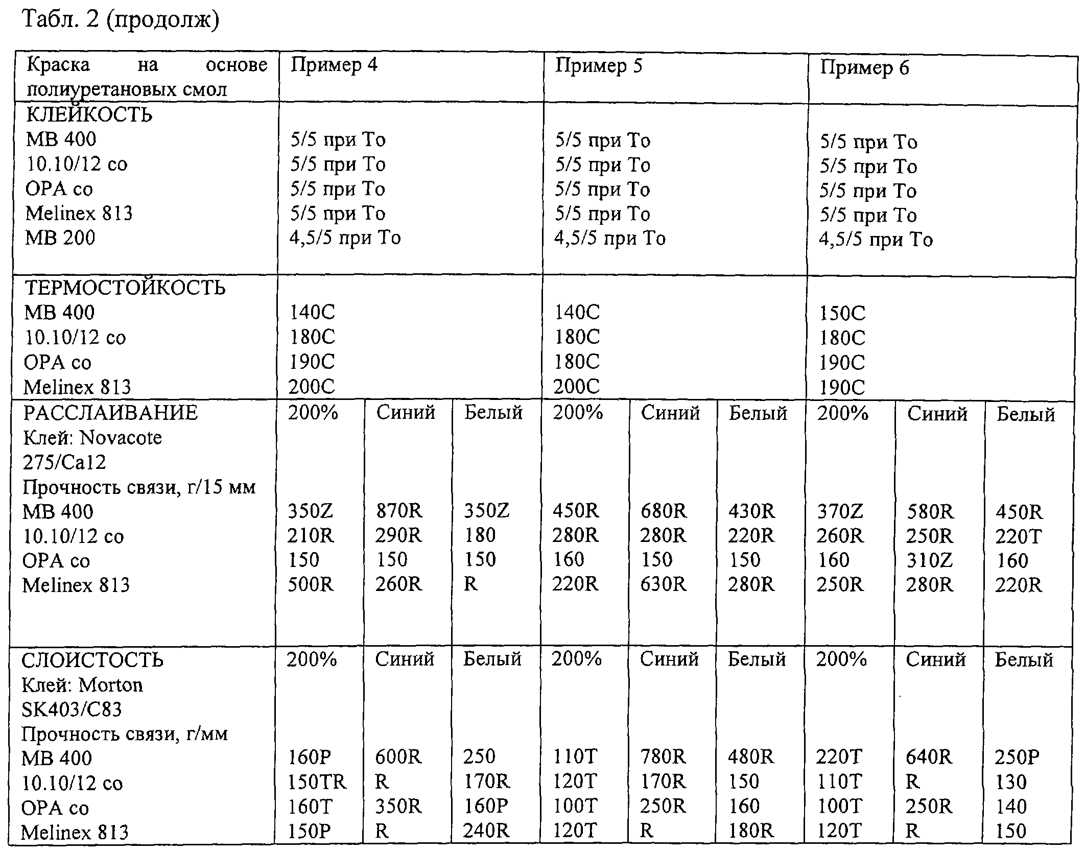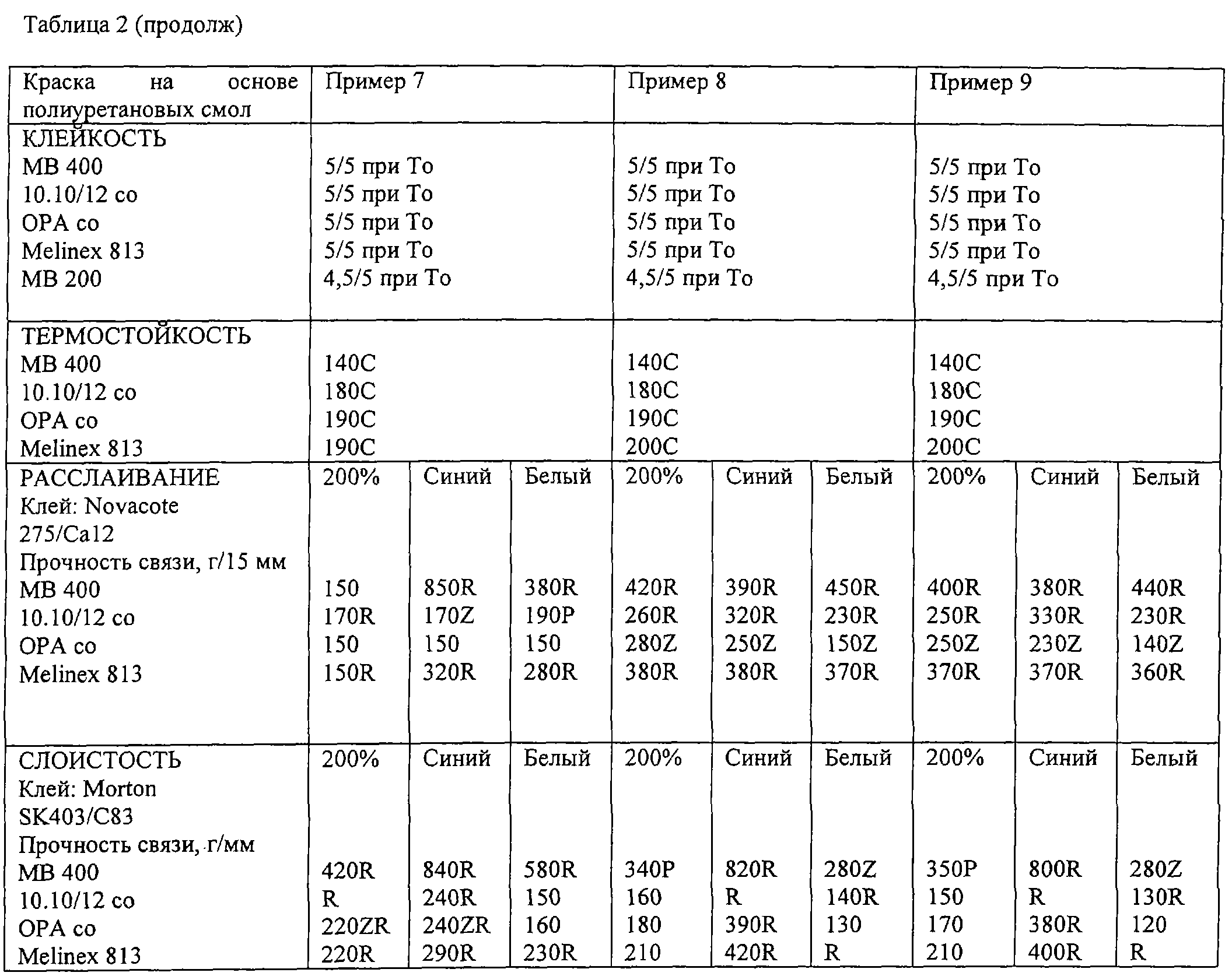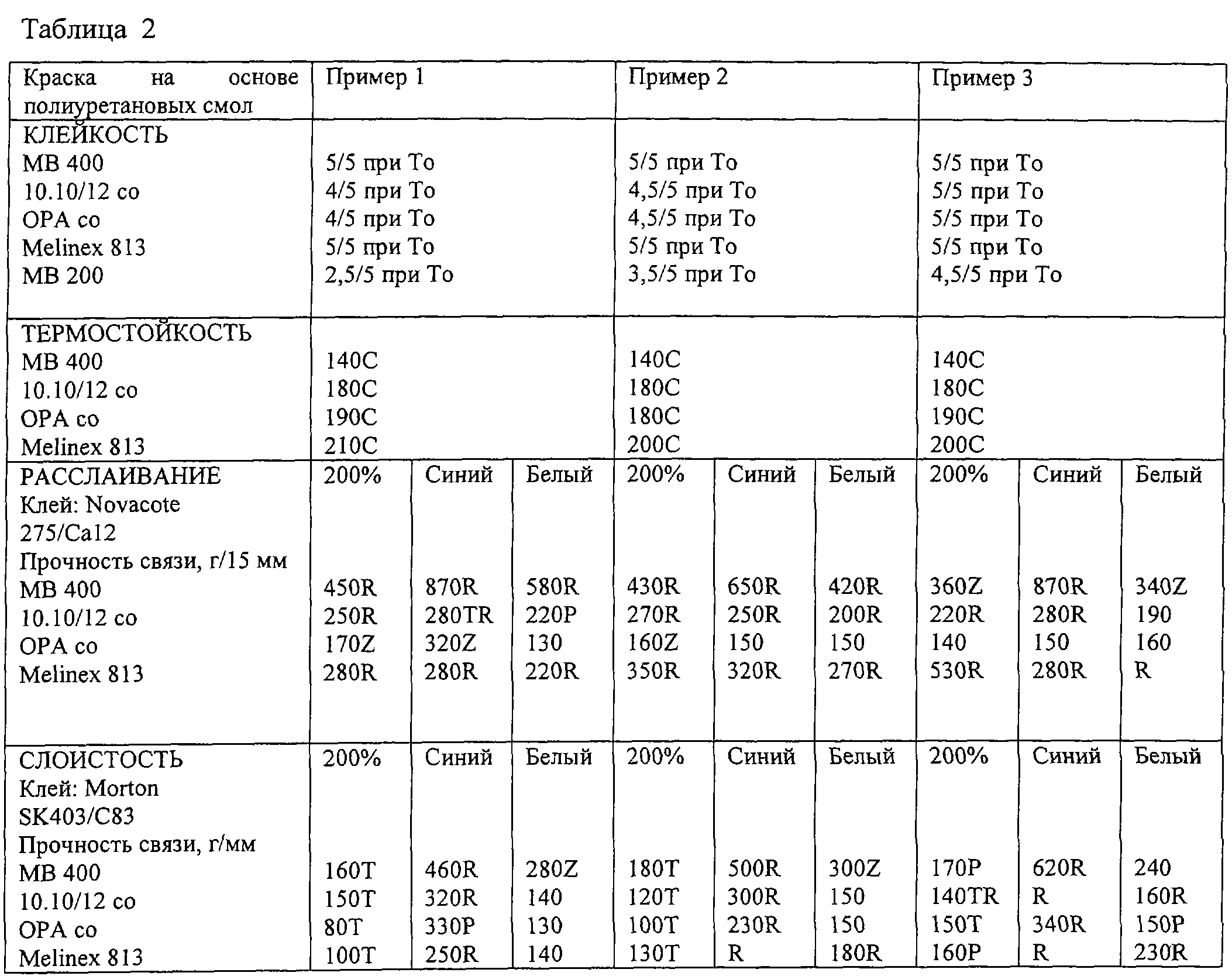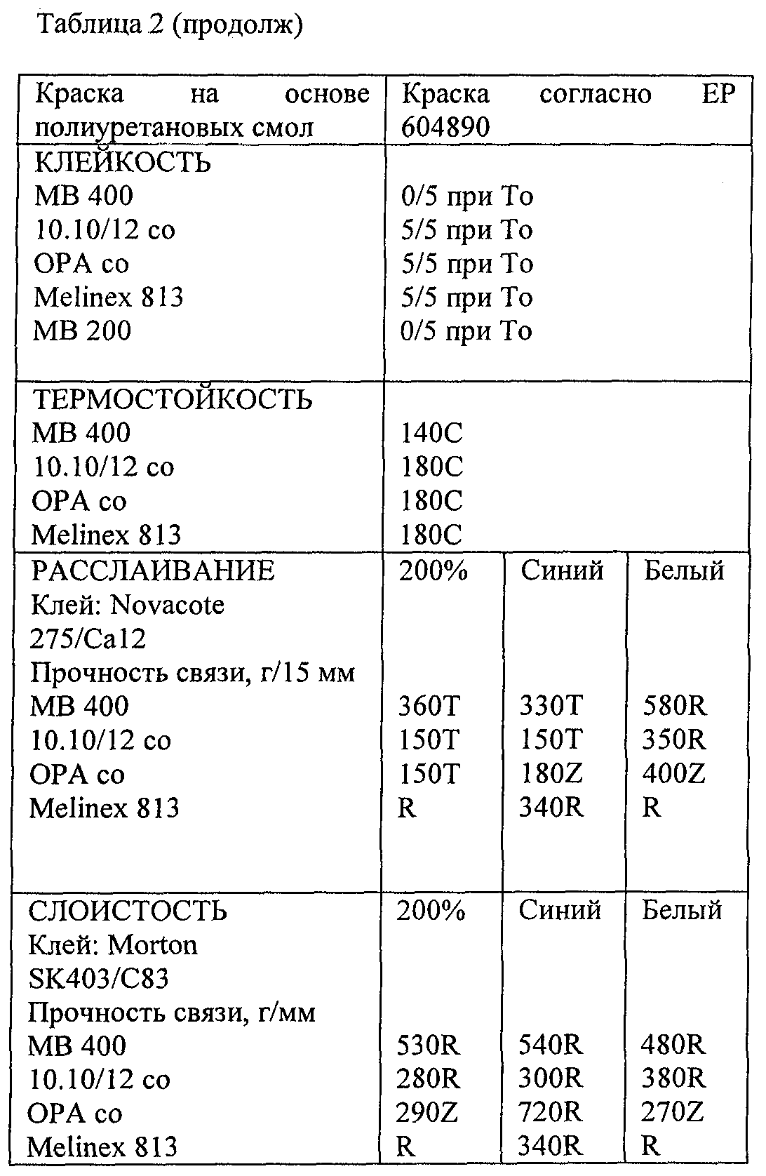 Первоначальная приклеиваемость и термостойкость проверялись по слою типографской краски по отношению к находящейся под ним подложке. Для испытания слоистости/расслаивания прочность связи проверялась по слою типографской краски между двумя пластмассовыми пленками. Противоположной подложкой для всех проверявшихся подложек была полиэтиленовая пленка низкой плотности. Испытываются: оттиск белой краски как единственный слой между двумя пластмассовыми слоями (указаны белым), оттиск синей краски как единственный слой между двумя пленками (указан синим), и наложение слоя синей и белок краски между двумя пленками (указано как 200%). Методикой получения слоистого материала является методика ламинирования на основе клея (клей: Mor-free SK403/C83 и Novacote 275/CA 12). Отпечатанный образец слоистого изделия шириной 15 мм поместили между двумя зажимами (динамометр типа Lhomargy). Образец вынули, и подложку отделили от противоположной подложки. Прочность связи (г/15 мм) и расслоение проверяемого слоистого изделия оценивали при скорости 200 мм/мин. Прочность связи выражена как сочетание числового значения и букв. Числовое значение указывает граммы, нужные, чтобы разделить слоистое изделие шириной 15 мм и при скорости динамометра 200 мм/мин. Чем выше будет значение, тем прочнее будет связь. Буквы указывают тип разъединения относительно слоя типографской краски: Т: перенос 100% слоя краски (с подложки на противоположную подложку). Р: расщепление слоя краски (между подложкой и противоположной подложкой). Z: стабильное значение для прочности связи отсутствует R: отрыв/разрыв одной из двух пленок слоистого изделия.