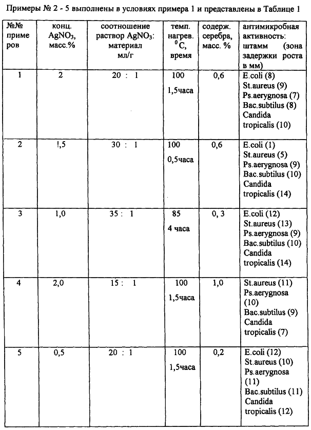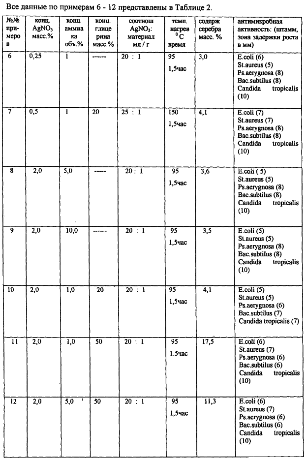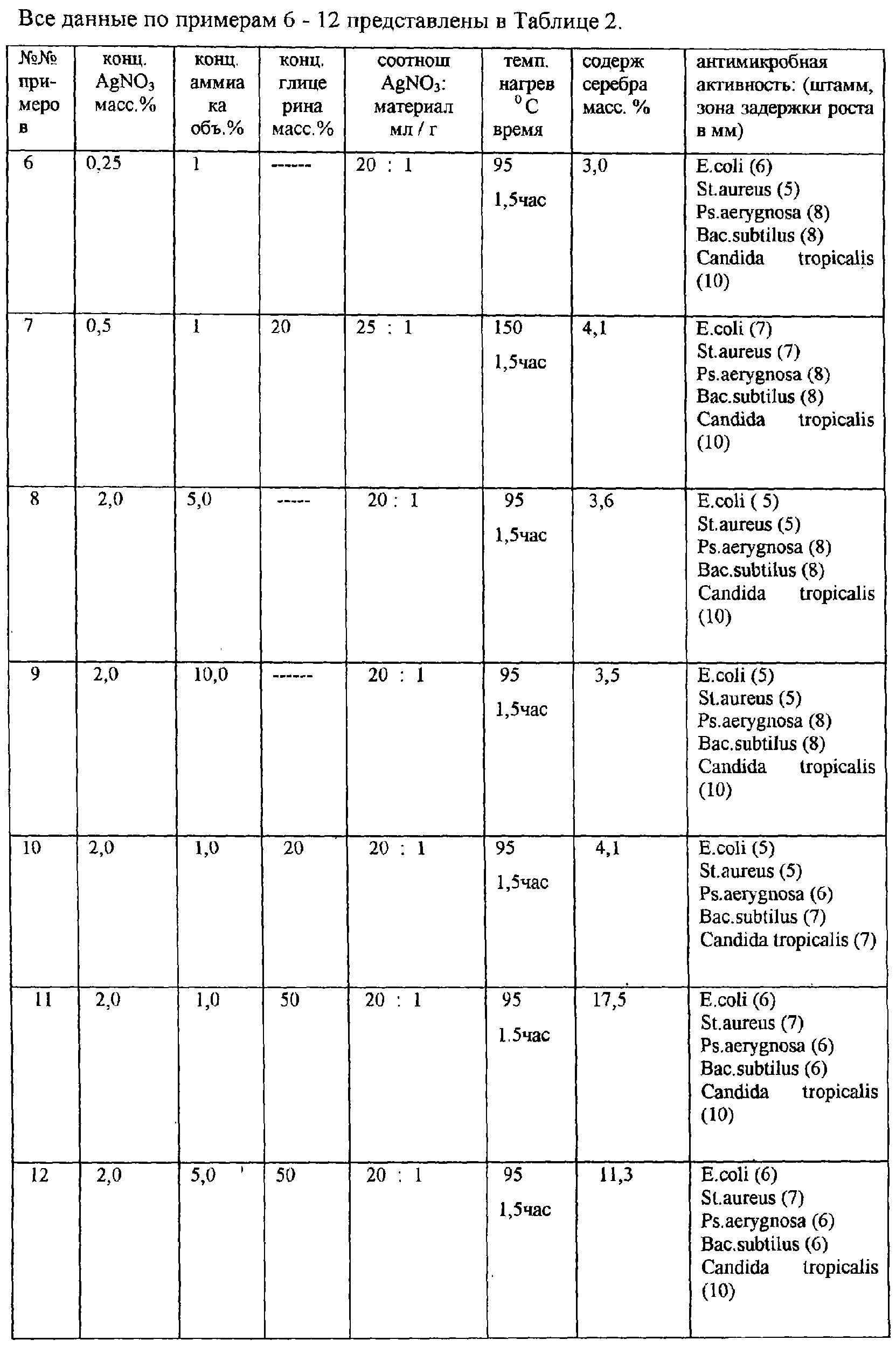 Настоящее изобретение относится к производству модифицированных целлюлозных материалов, более точно к получению серебросодержащей микрокристаллической целлюлозы, серебросодержащих хлопчатобумажных тканей, льняного волокна, перевязочных материалов. Полученные материалы при содержании в них металлического серебра 0,2-1,0% обладают высоким уровнем антимикробной активности по отношению к широкому ассортименту различных штаммов бактерий. Такие материалы могут быть использованы в качестве бактерицидных перевязочных средств, для производства медицинской одежды, нижнего белья, постельного белья, предметов гигиены. Можно предполагать, что на основе серебросодержащей микрокристаллической целлюлозы могут быть созданы эффективные лекарственные средства для лечения желудочно-кишечных заболеваний. При более высоком содержании серебра от 2 до 17,5 мас.% получаемые в соответствии с настоящим изобретением материалы могут использоваться в качестве фильтров для обеззараживания питьевой воды, в качестве антистатических средств, для отражения радарного излучения, в качестве экранов для электромагнитного излучения. Описаны антибактериальные целлюлозные волокна и способ их получения (Патент США №5985301, авторы К.Накамура и К.Накамура, Япония, дата подачи заявки 11 февраля 1998 г., дата публикации 16 ноября 1999 г.). В соответствии с этим патентом целлюлозные волокна получают сорастворением вискозы в третичном N-оксиде с серебросодержащим материалом (цеолит серебра, фосфат серебра и циркония, намагниченного мелкоизмельченного порошка с последующим мокрым формованием волокна из полученной массы в воду. Были получены прочные синтетические волокна длиной до 5 см, из которых получали перевязочные материалы с высокой антимикробной активностью. Однако этим известным способом нельзя придать антимикробную активность натуральным целлюлозным волокнам, а также готовым изделиям. Описано получение металлизированного текстиля (Патент США №5981066, автор Дж. Габби, Израиль, приоритет заявки 09 августа 1996 г., дата публикации 09 ноября 1999 г.). Процесс нанесения слоя металла на текстильный материал реализуется последовательными операциями активирования пропиткой материала раствором, содержащим легко окисляющиеся катионы, например, Pt2+ Sn2+, Ti3+ Затем проводят восстановление перечисленными катионами металлов, наносимых на текстиль, например, Cu2+, Ag+, Zn2+, Ni2+. Для интенсификации процесса дополнительно используют восстановители из ряда, включающего формальдегид, гидразин гидрат. При этом получают металлизированный материал с поверхностью полностью или частично покрытой слоем металла. В соответствии с известным изобретением получают материалы с бактерицидными и фунгицидными свойствами, которые могут найти использование в качестве ковровых покрытий, настенных покрытий, занавесок, драпировки мебели, для нанесения на внутреннюю поверхность контейнеров для хранения продуктов питания. Однако такого рода материалы не могут быть использованы для создания перевязочных средств, верхней одежды, белья. Известный способ многостадийный и достаточно сложный для воспроизводства. Задачей настоящего изобретения является создание способа получения серебросодержащей микрокристаллической целлюлозы, серебросодержащих хлопчатобумажных и льняных тканей, льняного 