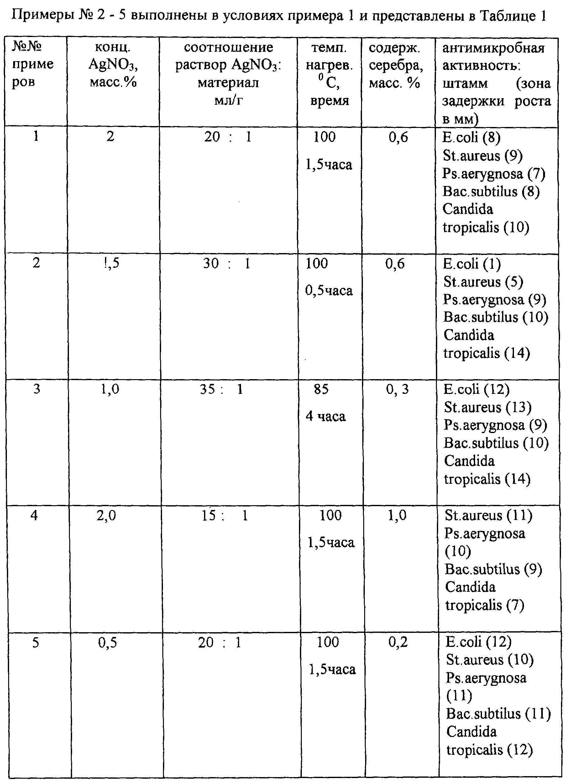 1. Способ получения серебросодержащих целлюлозных материалов путем воздействия на них водорастворимой солью серебра, состоящий в том, что целлюлозный материал при комнатной температуре пропитывают водным раствором 0,25 – 2,0 мас.% AgNO3 и нагревают реакционную смесь при 85 – 150° С в течение 1 – 4 ч. 2. Способ получения серебросодержащих целлюлозных материалов по п. 1, при этом в качестве целлюлозного материала используют материал из ряда, содержащего микрокристаллическую целлюлозу с СП от 120 до 275, хлопчатобумажное волокно, ткань и изделия из них, льняное волокно, полотно и изделия из них, хлопчатобумажный перевязочный материал. 3. Способ получения серебросодержащих целлюлозных материалов по п.1, при этом соотношение целлюлозный материал : раствор AgNO3 составляет 1 г на 15 – 30 мл. 4. Способ получения серебросодержащих целлюлозных материалов по п.1, состоящий в том, что в водный раствор AgNО3 дополнительно вводят аммиак, глицерин, либо смесь аммиака и глицерина; при этом концентрация AgNO3 составляет 0,25 – 2,0 мас.%, концентрация аммиака 0,5 – 15 об.%, концентрация глицерина 20 – 50 мас.%, соотношение целлюлозный материал : водный раствор составляет 1 г на 15-30 мл, нагревают реакционную смесь при 85 – 150°С в течение 1 – 4 ч.