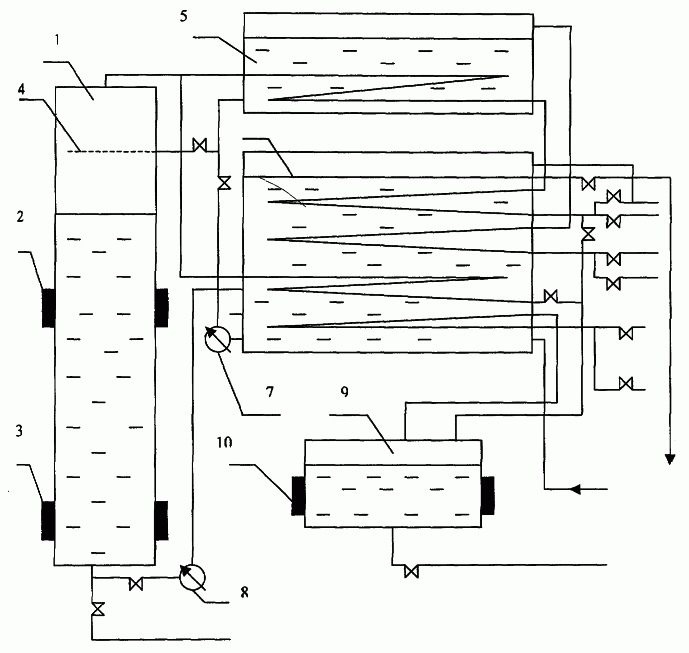 На чертеже изображена упрощенная схема заявляемого устройства. Оно содержит испарительную емкость 1 с верхним 2 и нижним 3 нагревательными поясами, трубку с отверстиями 4. Верхний патрубок емкости 1 соединен со змеевиком емкости 5 и первым змеевиком емкости 6. Причем выход змеевика емкости 5 соединен со входом второго змеевика емкости 6, верхний патрубок емкости 5 соединен со входом третьего змеевика емкости 6, а нижний патрубок емкости 5 соединен посредством кранов с трубкой 4 емкости 1 и насосом 7 от нижнего патрубка емкости 6. Также посредством кранов емкость 1 соединена насосом 8 со средним патрубком емкости 6 и сливной магистралью битуминозных продуктов. Верхний патрубок емкости 6 напрямую соединен с бензиновой магистралью, ниже расположенный патрубок посредством крана соединен со сливной нефтяной магистралью, а патрубок внизу – с наливной нефтяной магистралью. Четвертый змеевик емкости 6 соединен с выходным патрубком емкости 9 с нагревательным поясом 10, выходы змеевиков емкости 6 соединены посредством кранов с бензиновыми или дизельными магистралями кроме выхода первого змеевика, соединенного через кран с входным патрубком емкости 9, нижний патрубок которой соединен с магистралью газойля.