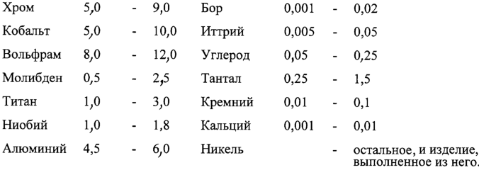 Технической задачей предлагаемого изобретения является разработка жаропрочного литейного никелевого сплава и изделий из него, обладающих высокой технологичностью при высокоградиентной направленной кристаллизации, в частности высоким сопротивлением возникновению горячих трещин при литье турбинных лопаток с однонаправленной структурой зерен в сочетании с высоким уровнем жаропрочности и жаростойкости.