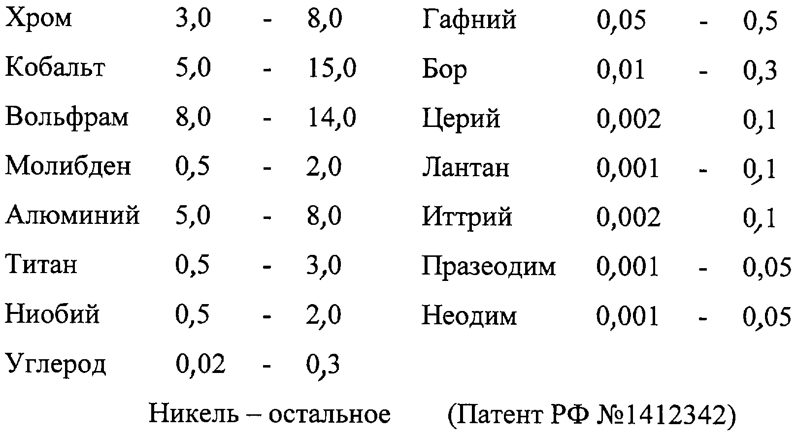 В металлургии широко известны литейные жаропрочные сплавы на основе никеля, содержащие вольфрам, хром, молибден, гафний, ниобий, кобальт, алюминий, такие как MAR-M247, ЖС26, ЖС26У, обладающие высоким уровнем длительной прочности, применяемые в газотурбинных двигателях авиационного назначения (Патент США №3748192, патент РФ №722330, патент РФ №1412342).
