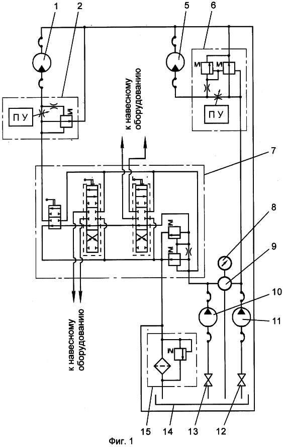 На фиг.1 представлена гидравлическая схема дорожной машины. Она состоит из: гидромотора привода транспортера 1; регуляторов потока 2, 6; гидромотора привода разбрасывателя 5; гидрораспределителя 7; манометра 8; переключателя манометра 9; насоса шестеренного 10; насоса шестеренного 11; кранов 12, 13; гидробака 14; фильтра 15.