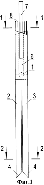 На фиг.1 показан вид сваи сбоку перед погружением, на фиг.2, 3 – сечения сваи перед погружением в верхней и нижней части соответственно, на фиг.4 – свая после погружения, на фиг.5 – схема расстановки свай в фундаменте, на фиг.6 – соответствующее сечение фундамента с показом расстановки свай и раскрытия элементов свай.